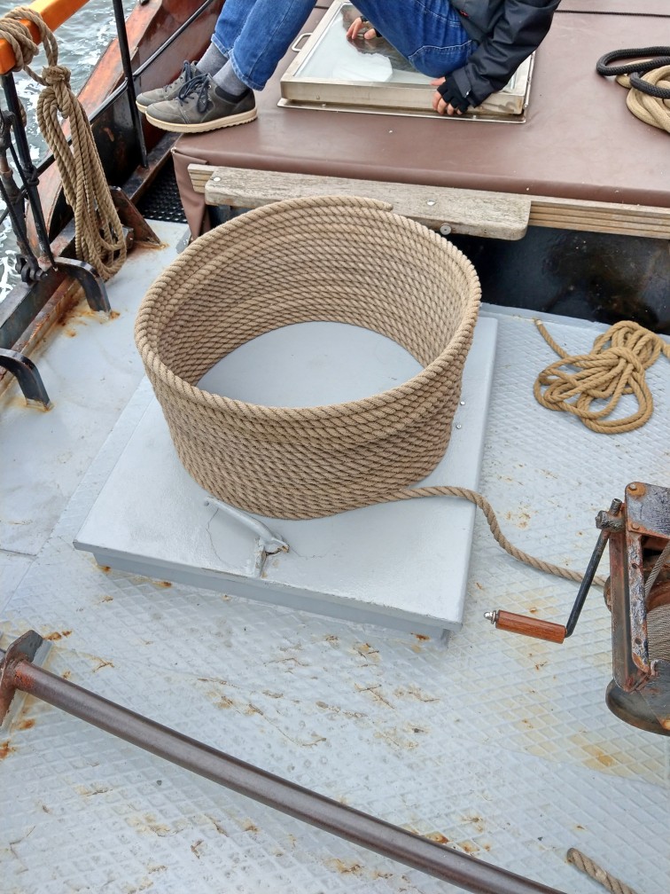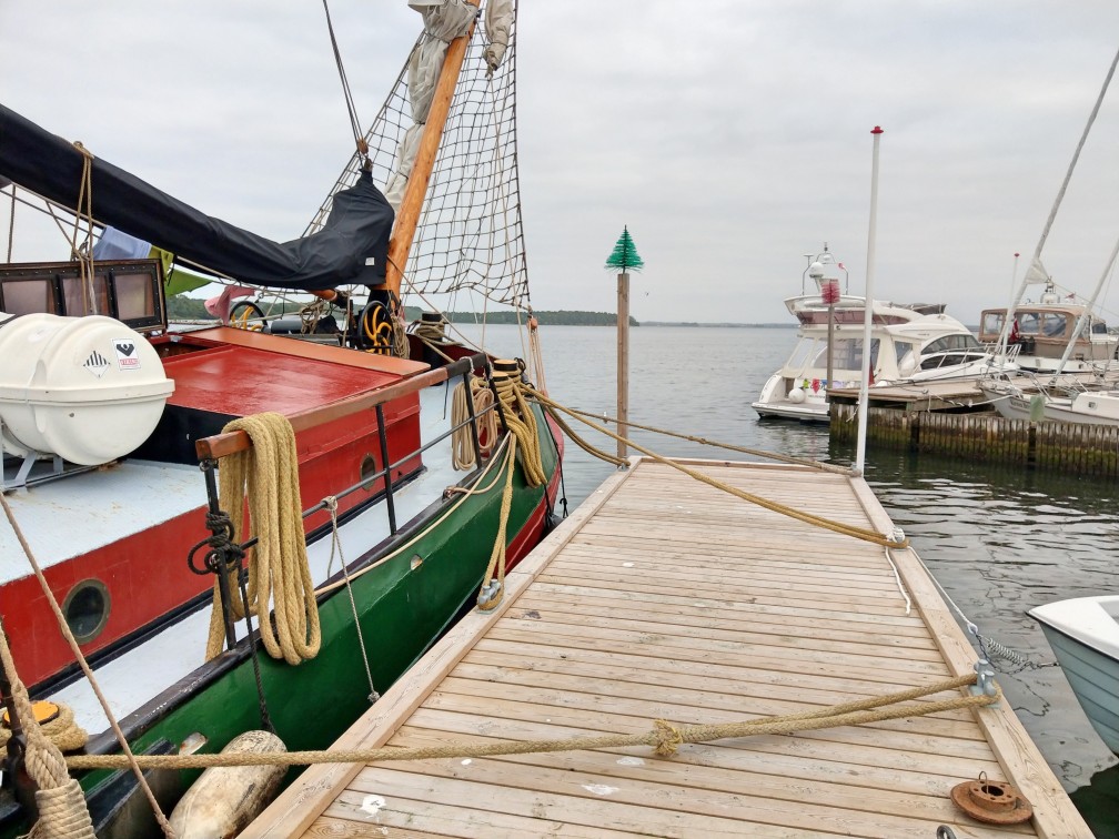 Klüverbaum getoppt um die Hafeneinfahrt nicht zu blockieren und viele Leinen, dass der Steg heil bleibt.